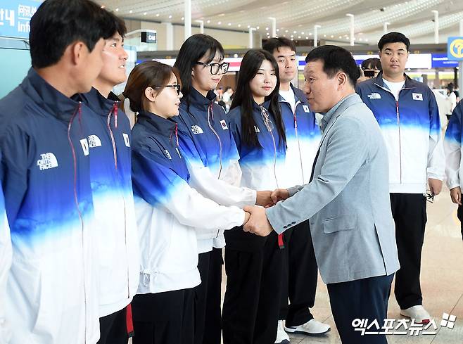 장영술 부회장 '출국하는 양궁 선수단 격려'[포토]