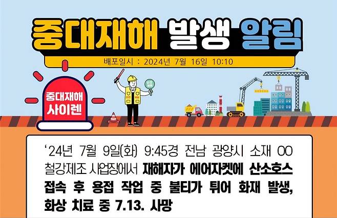 고용노동부 중대재해속보에 따르면 지난 9일 오전 전남 광양시 태인동의 한 철강 제조업체에서 용접작업을 하던 60대 노동자가 옷에 불이 옮겨 붙으면서 중상을 입고 병원으로 옮겨졌습니다.