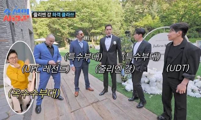 하객들이 하나둘씩 도착하며 '엔조이 부부' 임라라와 손민수, '국민 사랑꾼' 가수 션을 포함해 '코리안 좀비' 정찬성, '마린보이' 박태환 등 각종 스포츠 스타와 특수부대 출신 최영재, UDT 출신 에이전트 H 등 전직 군인들도 포착됐다. 줄리엔강이 특수부대 출신 소꿉친구까지 하객들에게 서로 소개하자, 최성국은 "강철부대야?"라며 폭소했다. 결혼식 MC를 봐줄 개그맨 윤형빈도 등장해 신랑과 신부 사이를 오가며 덕담을 건넸다. 마침내 야외에서 영화의 한 장면 같은 결혼식이 시작되었고, 결혼식 직전까지 신랑이 신부를 봐서는 안 되는 '퍼스트룩' 관습 때문에 온종일 제이제이를 기다려온 줄리엔강은 모든 절차를 서둘러 웃음을 자아냈다. 또 윤형빈은 신랑 신부의 '키스타임'을 1단계부터 5단계로 설정해 '아메리칸 스타일'을 방불케 하는 꽁냥 타임을 연출했다. 마지막으로 김조한이 축가로 'The last time'을 불러 감동을 선사했다.