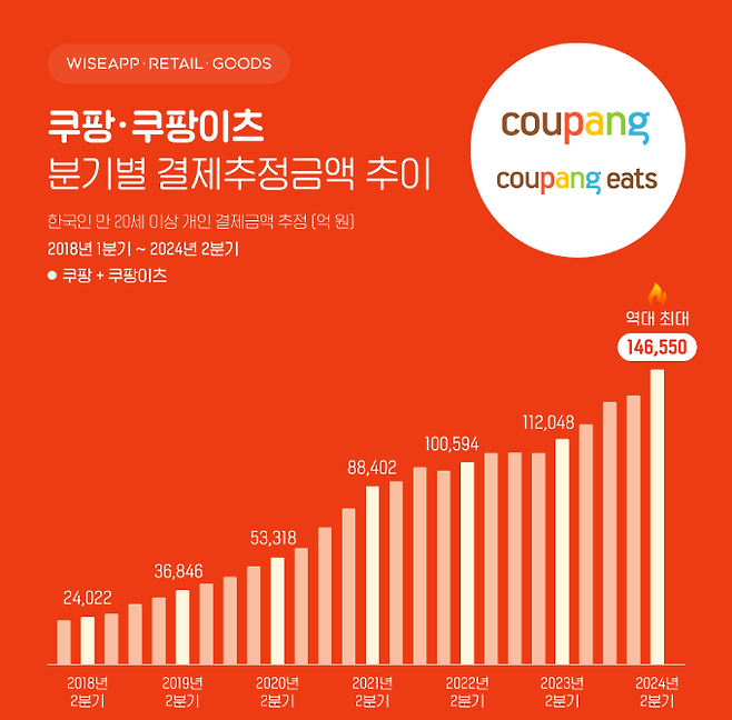앱·리테일 분석 서비스 와이즈앱·리테일·굿즈는 만 20세 이상 소비자의 신용카드, 체크카드, 계좌이체, 소액결제 등 결제금액을 표본조사한 결과 쿠팡과 쿠팡이츠의 올해 2분기 합산 결제추정금액이 14조6550억원으로 집계됐다고 16일 밝혔다. 이는 지난해 같은 기간(11조2048억원) 대비 31% 증가한 것으로 역대 최대 금액이다.