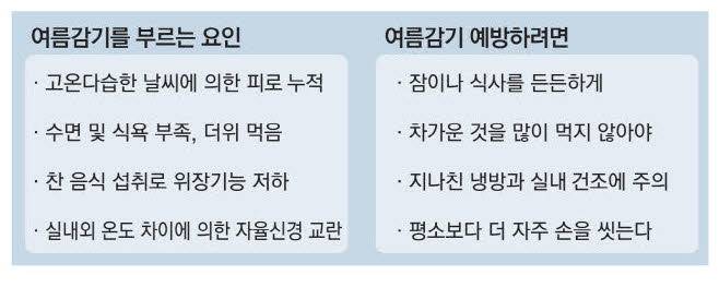 '오뉴월 감기는 개도 안 걸린다'는 속담이 있다. 그러나 여름에도 무더위로 인한 피로와 수면 부족 등 체력이 떨어지면 감기에 걸리기 쉽다.