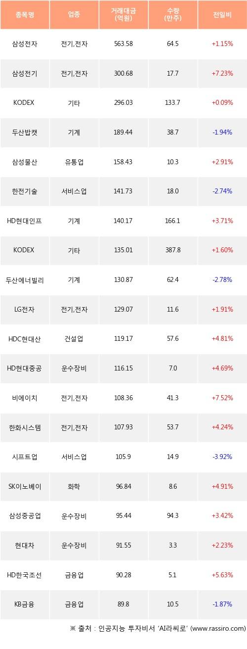 삼성전자, 삼성전기, KODEX 레버리지 등은 전일 대비 주가가 상승했고, 두산밥캣, 한전기술, 두산에너빌리티 등은 주가가 하락했다.