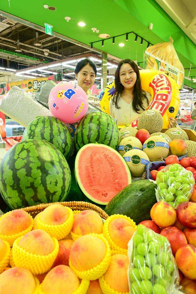 서울 서초구 농협 하나로마트 양재점에서 홍보 모델들이 수박, 복숭아, 레몬 등 제철 농산물을 선보이고 있다. 농협유통은 18일부터 제철 농·축·수산물 할인행사를 진행한다.