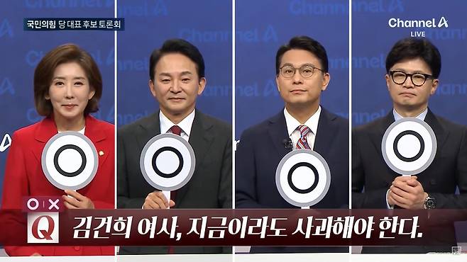 16일 오후, 채널A 주관으로 열린 제4차 전당대회 당 대표 후보 3차 방송토론회의 '오엑스(OX) 퀴즈' 코너에서 "김건희 여사, 지금이라도 사과해야 한다"라는 질문이 나오자 네 명의 모든 후보가 '오(O)' 팻말을 든 것이다. 명품 가방 수수 의혹과 관련해, '친윤(석열)'이든 아니든 모든 당 대표 후보자가 영부인의 직접 사과 필요성을 인정한 셈이다.