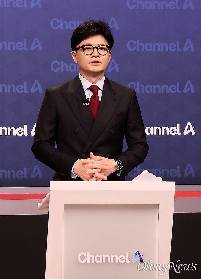 | ▲ 한동훈 국민의힘 당 대표 후보가 16일 오후 서울 마포구 상암동 채널A 스튜디오에서 열린 3차 당 대표 후보 방송토론회에서 토론 준비를 하고 있다. |