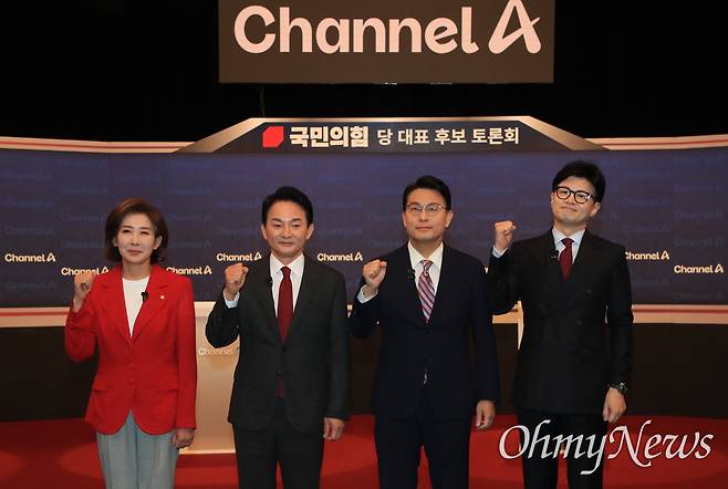 | ▲ 국민의힘 나경원(왼쪽부터), 원희룡, 윤상현, 한동훈 당 대표 후보가 16일 오후 서울 마포구 상암동 채널A 스튜디오에서 열린 3차 당 대표 후보 방송토론회 시작에 앞서 기념촬영을 하고 있다. |