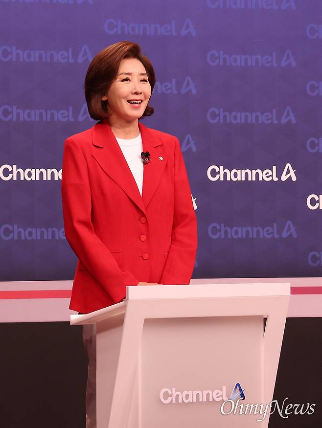 | ▲ 나경원 국민의힘 당 대표 후보가 16일 오후 서울 마포구 상암동 채널A 스튜디오에서 열린 3차 당 대표 후보 방송토론회에서 토론 준비를 하고 있다. |