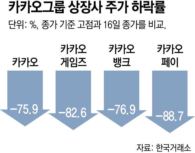 카카오의 주가는 16일 4만900원까지 떨어지면서 고점 대비 75.9% 하락했다. 카카오페이(―88.7%), 카카오뱅크(―76.9%), 카카오게임즈(―82.6%) 등의 주가도 고점 대비 70∼80%가량 떨어졌다.