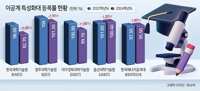 하락폭이 가장 컸던 대학은 카이스트로, 2022학년도에 98.6%였던 등록률이 2024학년도에 82.7%로 15.90%포인트 감소했다. DGIST는 같은 기간 등록률이 100.9%에서 89.1%로 11.8%포인트, GIST는 109%에서 101.3%로 7.7%포인트 줄었다. 이밖에 KENTECH는 97.3%에서 95.5%로 1.8%포인트, UNIST는 101.6%에서 100.4%로 1.2%포인트 등록률이 감소했다.