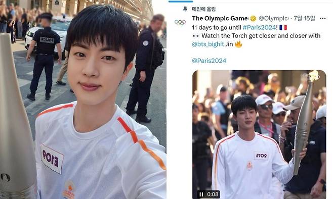 전 세계적으로 폭발적인 인기를 끌고 있는 '방탄소년단' 멤버 진의 성화봉송 영상이 파리 올림픽 공식 계정에 고정됐다.