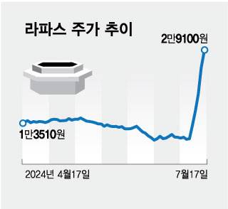 라파스는 대원제약과 글로벌 비만치료제 '위고비' 성분인 세마글루타이드 패치제형인 'DW-1022'의 임상 1상을 진행 중이다. 지난 3월 승인받은 국내 1상이 오는 10월 종료될 것이란 소식이 알려진 지난 11일부터 4거래일 간 매일 20% 이상의 상승률을 이어갔다. 이날 역시 전일 대비 13.9%의 상승폭을 기록했다.