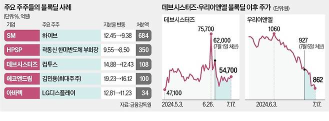 게임기업 컴투스는 지난 1~2일 이틀에 걸쳐 데브시스터즈 주식 17만3904주(108억원)를 블록딜 방식으로 매도했고, 하이브는 5월 SM엔터테인먼트 지분 75만5522주(684억원)를 축소해 현금화했다.