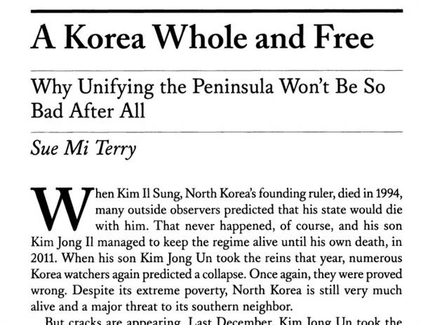| ▲ 수미 테리 선임연구원이 <포린 어페어스>(Foreign Affairs) 2014년 7·8월호에 기고한 ‘전체로서의 한국과 자유 : 반도 통일이 결국 그렇게 나쁘지 않은 이유’(A Korea Whole and Free : Why Unifying the Peninsula Won't Be So Bad After All). |
