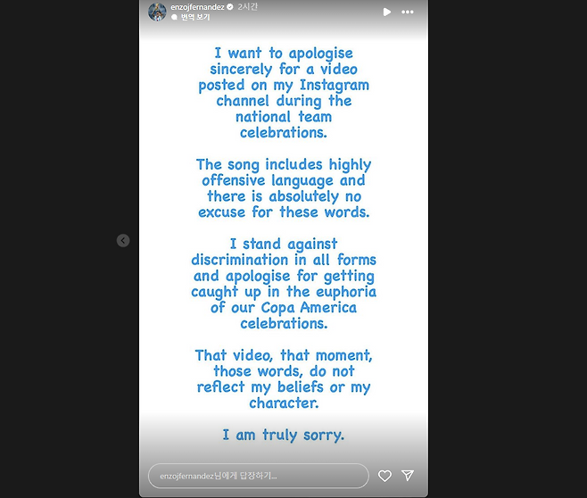 그리고 엔조는 사과했다. 그는 17일(한국시간) 자신의 SNS를 통해 “국가대표 축사 때 SNS에 올라온 영상에 대해 진심으로 사과드리고 싶다”라고 시작했다.