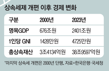더 큰 문제는 높은 세부담이 중산층으로도 빠르게 옮겨가고 있다는 점이다. 상속세 제도는 2000년 최고세율이 45%에서 50%로 높아진 후 변동이 없다. 반면 그동안 경제 상황은 크게 달라졌다. 2000년 1428만원에 불과했던 1인당 국민총소득(GNI)이 지난해 4725만원으로 3배 넘게 뛰었다.