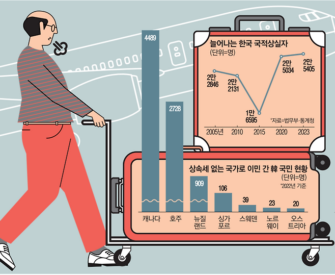 이 중에는 상속세를 피해 이민에 나선 경우도 많은 것으로 추정된다. 실제로 세부 통계가 있는 2022년 기준으로 보면, 국적상실자 가운데 상속세가 없는 캐나다와 호주, 싱가포르를 비롯한 13개국으로 옮겨간 국민(8316명)은 최근 10년 새 2배 늘었다. 전체 국적상실자 10명 중 3명(32.7%)이 상속세를 매기지 않는 나라로 이주한 셈이다.