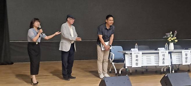 | ▲ 영화 <송암동>을 제작한 이조훈 감독(사진 맨 오른쪽)과 책 <시민군>을 편집한 필자(황광우, 사진 가운데). |
