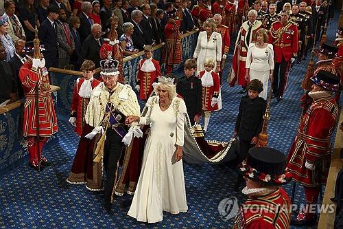 Britain's King Charles and Queen Camilla walk through the Royal Gallery on the day of the State Opening of Parliament at the Palace of Westminster in London, Wednesday, July 17, 2024. (Hannah McKay/Pool Photo via AP) POOL PHOTO