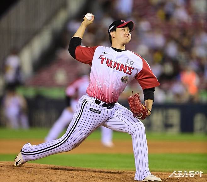 17일 서울 잠실야구장에서 열린 ‘2024 신한 SOL 뱅크 KBO리그’ SSG 랜더스와 LG 트윈스의 경기에서 9회초 LG 유영찬이 교체로 마운드에 올라 역투하고 있다. 잠실 | 주현희 기자 teth1147@donga.com