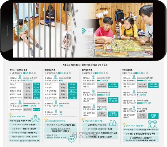 철저한 계획을 기반으로 스마트폰의 유혹을 완전히 떨쳐낸 ‘모범 가족’도 있었다. 이숙경(43)씨 가족은 실험 참가자 가운데 유일하게 가족 구성원 모두 하루 평균 스마트폰 사용 시간이 1시간 이내로 줄었다. 특히 스마트폰을 사용했던 시간을 오롯이 가족과 함께하는 시간으로 바꾸기도 했다.