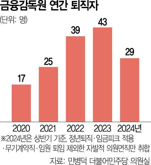 17일 서울경제신문이 민병덕 더불어민주당 의원실을 통해 금감원으로부터 제출받은 '2010~2024년 퇴직자(정년퇴직, 임금피크 적용, 무기계약직, 임원 퇴임 제외) 현황'에 따르면 올 상반기에만 29명의 직원이 금감원을 떠났다.