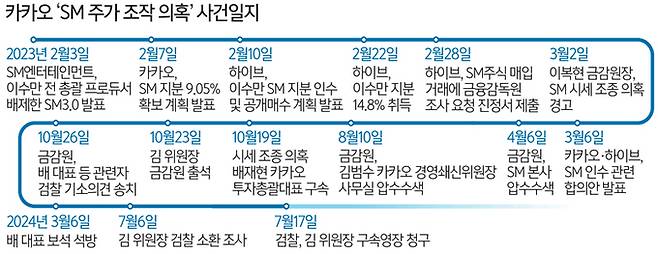 김 위원장은 지난해 2월 SM엔터 경영권 인수 당시 하이브의 공개 매수를 방해할 목적으로 SM엔터 주식의 시세를 하이브의 공개매수가보다 높게 끌어올리려 한 혐의를 받는다. 검찰은 카카오가 사모펀드 운용사 원아시아파트너스와 공모해 지난해 2월 16~17일, 27~28일 총 553회에 걸쳐 2400여억원을 투입해 SM엔터 주식을 공개매수가인 12만원보다 높은 가격에 사들여 주가를 올린 것으로 보고 있다.