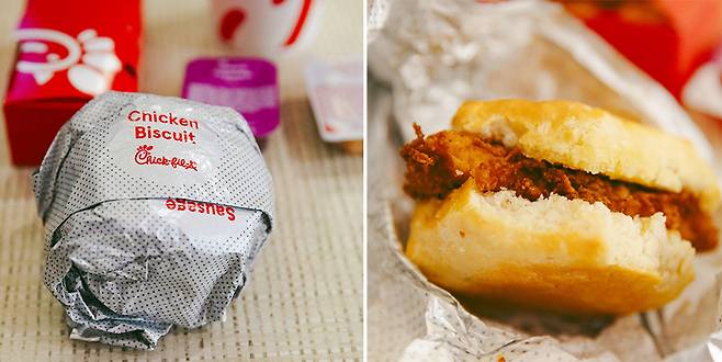 칙필레의 매력 또 한 가지. 칙필레부터 바비큐, 허니 머스터드, 폴리네시안, 스위트 & 스파이시 스리라차, 제스티 버팔로까지 중독성 강한 디핑소스가 준비돼 있다. 참, 아침에는 대표 메뉴를 판매하지 않는 것도 기억하자. 대신 칙필레 치킨 비스킷, 치킨과 에그 & 치즈 비스킷 등의 아침 메뉴가 빈자리를 채운다.