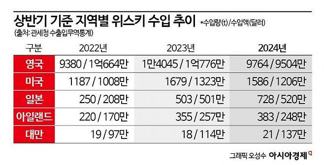2020년 상반기 기준 7559t이었던 위스키 수입량은 지난해 1만6864t으로 3년 새 123.1% 증가했고, 수입액 역시 5047만달러(약 700억원)에서 1억3336만달러(약 1850억원)로 3배 가까이 늘었다. 지난해 위스키 수입량은 직전 해(2만7038t)보다 13.1%(3548t) 증가한 3만586t으로 관련 통계가 있는 2000년 이후 역대 최고치를 기록하기도 했다.