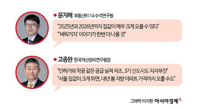 고종완 한국자산관리연구원장도 "인허가와 착공 같은 공급 실적이 저조하고, 3기 신도시도 지지부진한데다 공사비까지 올라 재건축도 어려운 상황"이라며 "공급이 줄어드는 만큼 집값이 더 오를 것"이라고 전망했다. 또한 "올해 초와 비교해 대출금리가 낮아지고 신생아 특례 대출까지 가세했다"며 "서울 집값이 크게 오르는 경우, 내년 봄 지방 아파트 가격까지 오를 수 있다"고 전망했다.