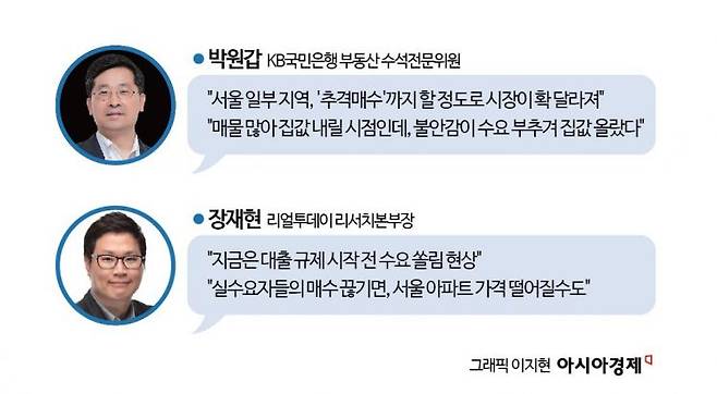서울 아파트 가격 방향이 어디로 갈지 지금은 단정할 수 없다는 견해도 나왔다. 박원갑 KB국민은행 부동산 수석전문위원은 "올해 초만 해도 부동산 시장의 어젠다는 '이런 고금리에 누가 집을 사냐'는 것이었다"며 "그런데 지금은 급매도 다 소진됐고 서울 일부 지역에서는 자산 가치 상승 시점에 추가 상승을 바라고 집을 사는 '추격 매수'까지 할 정도로 시장이 확 바뀌었다"고 밝혔다.