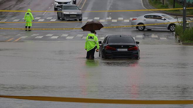 우비를 입어도 근무복이 모두 젖은 경찰관들이 폴리스라인을 치고 진입하려는 차들을 향해 팔로 엑스자를 하며 차량을 우회시키는 등 혼란한 상황이 이어졌습니다.