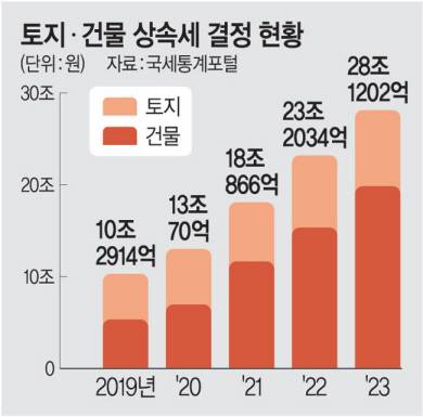 18일 국세정보포털에 따르면 지난 2019년 10조2914억 원(토지+건물)이었던 부동산 재산에 대한 상속세는 지난해 28조1202억 원으로 2.7배로 증가했다. 토지를 뺀 건물만 산정할 경우 5조3220억 원에서 19조8454억 원으로 3.7배가량으로 폭증했다. 지난 5년간 부동산 시세가 크게 오르면서 상속세 납부 대상자 수와 납부 액수가 증가한 데 따른 세수 증가로 풀이된다. 특히 20억 원 이하의 총 상속재산을 소유한 경우가 전체 피상속인의 약 70%를 차지했다. 2023년 상속세를 부과받은 1만9944명 중 가장 많은 비율(41%·8305명)이 10억 원 이상∼20억 원 이하의 재산을 소유한 경우였다. 2019년만 해도 해당 구간의 피상속인은 3513명에 불과했다. 두 번째로 높은 비율은 5억 원 이상∼10억 원 이하(5026명)였다. 5억 원∼20억 원 이하의 상속재산을 가진 이들이 전체 피상속인 10명 중 7명에 달한 셈이다. 물론 13조6867억 원에 달하는 지난해 상속세 중에서 이들이 부담하는 총 상속세 자체는 8844억 원 수준에 불과했지만, 자산 가격 상승에 따라 상속세 부담을 새롭게 짊어지는 중산층이 급증하는 추세는 확연했다.