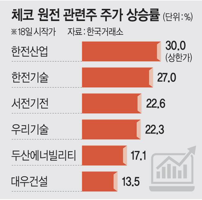 '팀코리아'가 24조 원대로 추산되는 체코 신규 원전 우선협상대상자로 선정됐다는 소식에 따라 원전주들이 장 초반 급등세를 탔다.