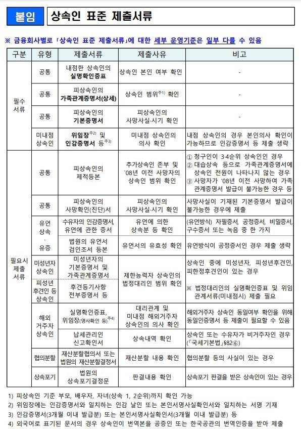 상속재산 명의 변경과 지급 의뢰서, 상속인 위임장 등 신청서 양식과 소액 인출 절차 간소화 기준 등이 금융사별로 상세히 안내되도록 바뀝니다.