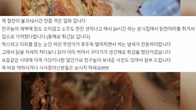 글을 올린 A 씨는 "(사 온 통닭을) 먹으려고 다리를 뜯는 순간 하얀 무언가가 후드득 떨어지면서 썩는 냄새가 진동했다더라"라며 통닭 안에 구더기 수십 마리가 있는 사진을 공개했습니다.