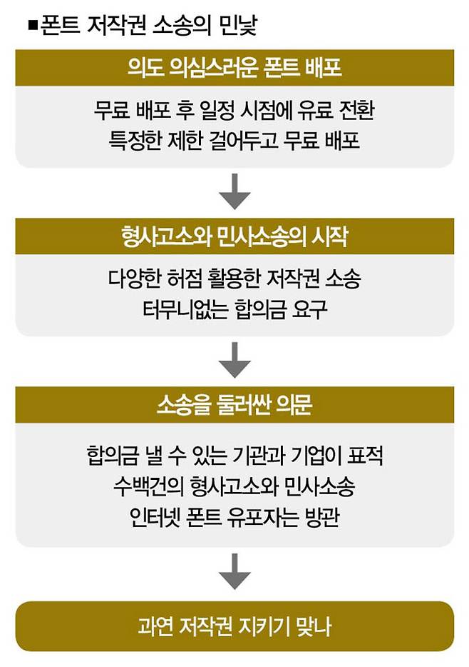 문제는 '폰트 파일의 설치ㆍ사용'을 은근히 부추겨 저작권 침해를 유발하고, 이를 빌미로 저작권 소송을 남발해 합의금을 뜯어내는 이들도 적지 않다는 점이다.