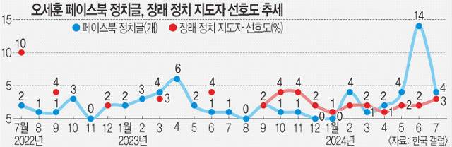 오 시장은 시정 성과를 토대로 최근 정치적 존재감을 끌어올리고 있다. SNS에 정치 현안 관련 발언이 크게 늘어난 것이 단적인 예다. 오 시장은 2022년 7월 민선 8기 취임 이후 2년 동안 정치 현안과 관련해 16일 기준 모두 합쳐 61건의 메시지를 페이스북에 썼다. 그런데 그 중 36%에 달하는 22건이 지난 5월 이후 작성됐다. 특히 오 시장은 지난달 정치 관련 메시지만 14건을 썼는데, 이는 상당히 이례적이다. 최근 2년간 오 시장의 페이스북 작성 건수는 1달 평균 10건에 불과했기 때문이다.