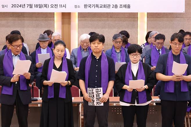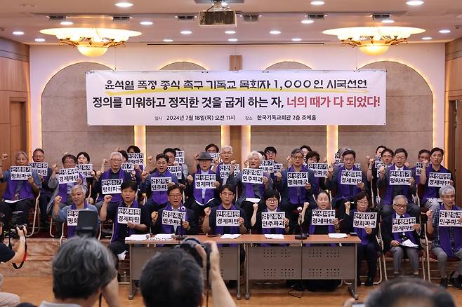 18일 오전 11시 한국기독교회관에서 개신교계 목회자 1004명이 채 상병 1주기를 맞아 윤 대통령에게 폭정을 멈추고 물러나라고 촉구하는 시국선언을 발표했다.