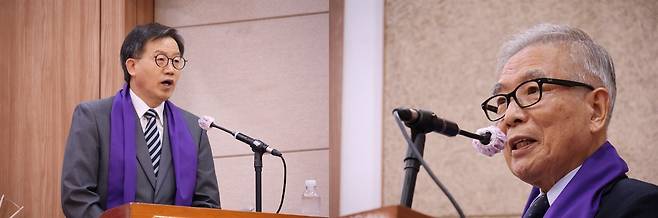 | ▲ 송병구 목사(좌측)는 시국선언 취지와 경과보고를 하며 윤 대통령을 향한 목회자들의 분노를 표했으며, 김상근 목사(우측)도 윤 대통령을 맹목적으로 추종하는 목회자·신도들에게 정신차리라고 경고했다. |