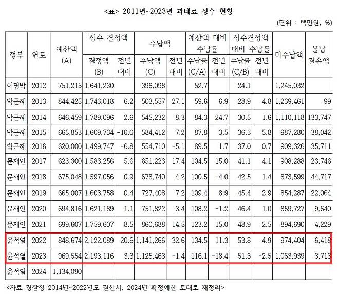 | ▲ 나라살림연구소에서 17일 경찰청 예산서를 토대로 분석한 2012년~2023년 과태료 징수 현황 |