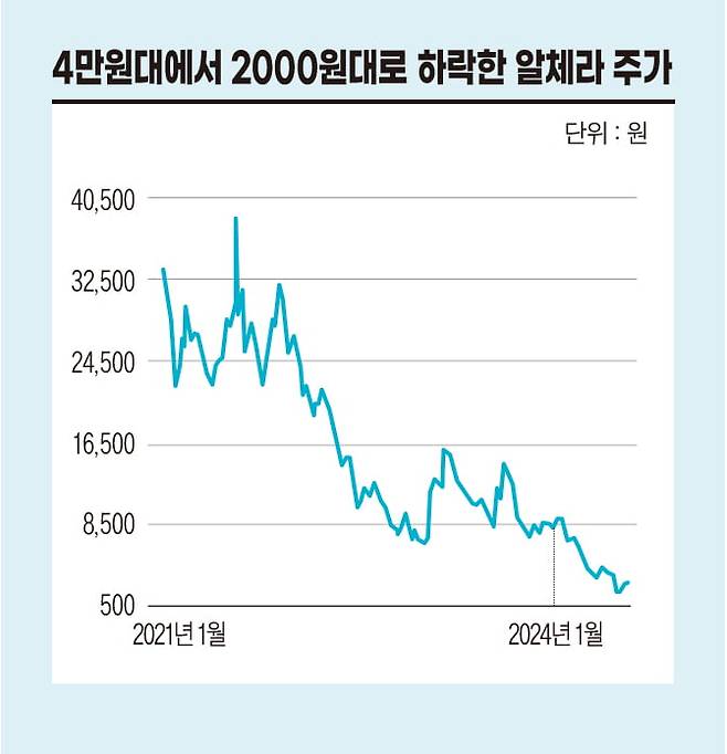 한때 영상인식 인공지능(AI) 기업 알체라를 향했던 찬사다. 하지만 주가는 추락의 연속이었다. 4만원을 웃돌던 주가가 3년 만에 2000원대로 내려앉았다. 2021년부터 악재가 겹친 탓이다. 메타버스 테마주 버블이 꺼졌고 지난해에는 570억원의 유상증자 계획이 무산됐다.