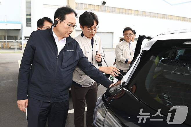 (서울=뉴스1) = 정인교 산업통상자원부 통상교섭본부장이 18일 오후 울산시 북구 현대자동차 울산5공장을 방문, 관계자로부터 운영현황 및 애로사항을 청취하고 있다. (산업통상자원부 제공) 2024.7.18/뉴스1