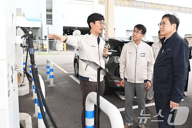 (서울=뉴스1) = 정인교 산업통상자원부 통상교섭본부장이 18일 오후 울산시 북구 현대자동차 울산5공장을 방문, 관계자로부터 운영현황 및 애로사항을 청취하고 있다. (산업통상자원부 제공) 2024.7.18/뉴스1