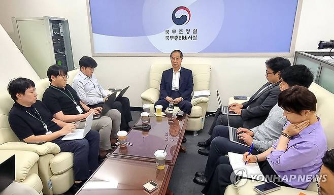 (세종=연합뉴스) 배재만 기자 = 한덕수 국무총리가 18일 오후 정부세종청사 총리실 기자실에서 출입기자단 간담회를 열고 있다. 2024.7.18