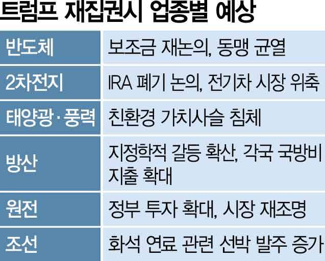 원전주와 조선주 주가에는 친환경 에너지보다 화석연료 투자를 선호하는 트럼프 전 대통령의 성향에 대한 기대가 반영됐다. 시장 참여자들은 미국의 화석연료 투자가 늘수록 액화천연가스(LNG)·액화석유가스(LPG)·암모니아선 발주가 증가할 수 있다고 예상하고 있다. 아울러 바이든 행정부 들어서는 외면받은 원전 에너지가 다시 관심을 받을 수 있을 것으로 판단하고 있다. 건설주의 경우 러시아·우크라이나 전쟁 조기 종식에 따른 전후 재건 수혜 업종으로 꼽힌다. 가상자산 관련주는 트럼프 전 대통령의 잇단 가상자산 우호 발언의 덕을 보고 있다.