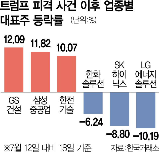 국내 주식시장이 11월 미국 대선을 4개월가량 남긴 시점부터 휘청거리는 것은 그 어느 때보다 현지 선거 윤곽이 일찌감치 뚜렷해졌기 때문이다. 민주당 후보인 조 바이든 대통령의 건강 문제가 부각되는 가운데 이달 13일(현지 시간) 도널드 트럼프 전 대통령 피격 사건까지 겹치면서 시장 참여자 대다수는 미국 대선 판세가 급격하게 공화당 쪽으로 기울었다고 보고 있다. 미국 우선주의를 내세우는 트럼프 전 대통령의 당선 확률이 크게 뛰면서 당분간 정책 피해·수혜 업종을 중심으로 증시 변동성이 커질 수 있다는 것이 증시 전문가들의 지배적인 관측이다.
