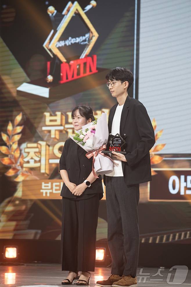 (서울=뉴스1) 유승관 기자 = 18일 서울 중구 크레스트72에서 열린 MTN 주최 2024 방송광고페스티벌에서 뷰티·헬스케어 부문 최우수상을 수상한 아모레퍼시픽 관계자가 정미경 머니투데이방송 전무와 기념 촬영을 하고 있다. 2024.7.18/뉴스1