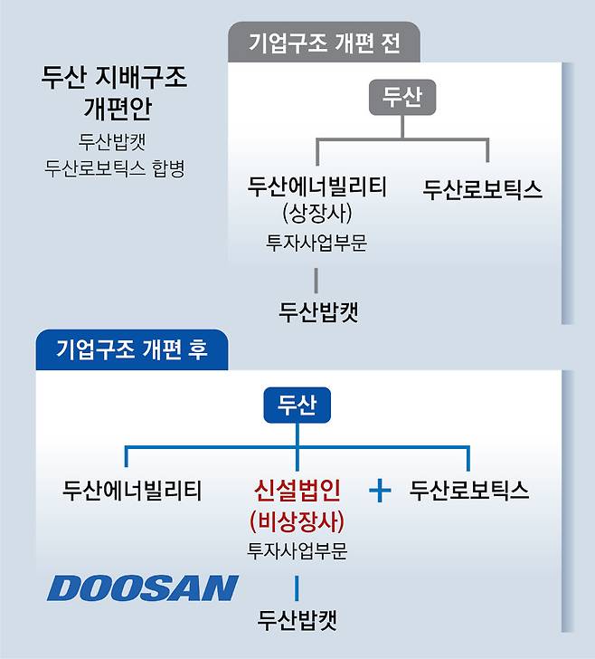 앞서 두산그룹은 그룹의 ‘캐시카우’ 역할을 하고 있는 두산밥캣을 두산로보틱스의 완전자회사로 이전하는 사업 구조 개편을 발표했다. 그러면서 안정적으로 이익을 내고 있는 두산밥캣과 적자를 기록 중인 두산로보틱스의 합병 비율을 1 대 0.63으로 정했다. 밥캣 주식 1주를 로보틱스 주식 0.63주로 바꿔 준다는 의미다. 두산 측은 양사의 주가 수준을 토대로 합병 비율을 정하는 현행법을 따랐다는 입장이지만 이 같은 결정은 주주들 사이에서 논란이 됐다. 밥캣의 주주는 꾸준히 수익을 내는 알짜 주식을 들고 있다가 이를 적자 기업의 주식으로 교환받아야 하고, 그마저도 받는 주식 수도 줄어드는 상황이 됐기 때문이다.