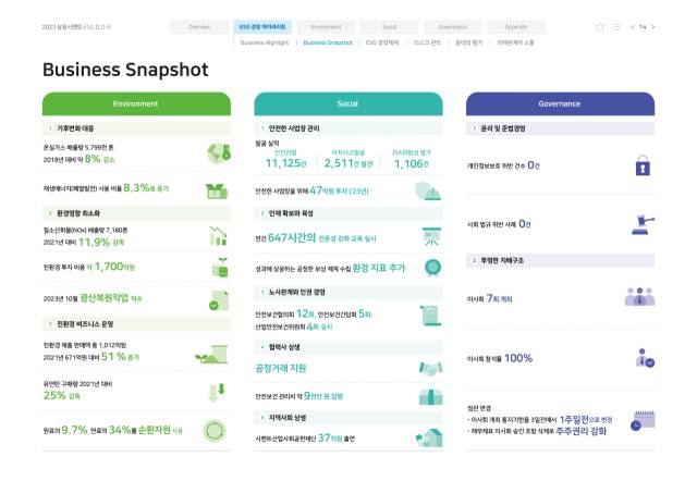 삼표시멘트(038500)가 ESG(환경·사회·지배구조) 경영 활동 주요 성과와 중장기 추진 전략을 담은 '2023 삼표시멘트 ESG 보고서'를 발간했다고 17일 밝혔다.