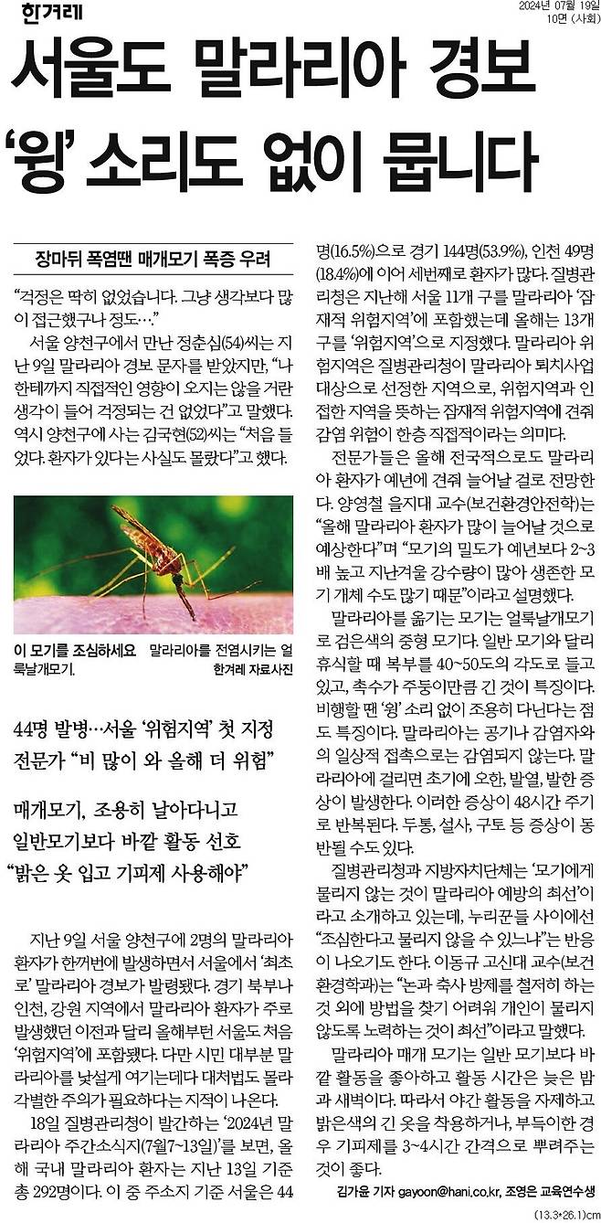 - 장마 뒤, 말라리아 주의